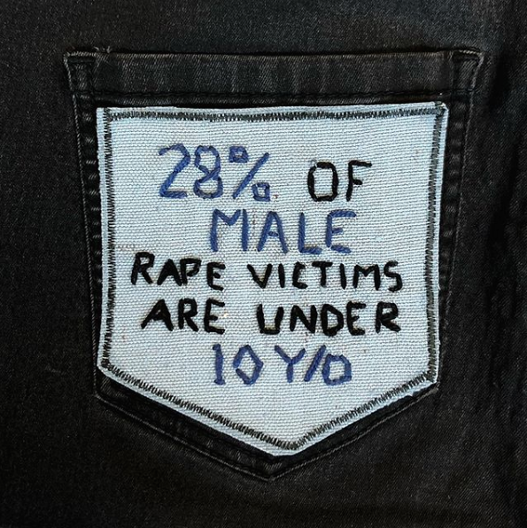Non ho in realtà tenuto ancora mostre ufficiali del progetto perché le toppe sono fatte per essere indossate in ambienti pubblici di tutto il pianeta. Ho una statistica differente su ogni paio dei miei jeans, dato che scelgo quale indossare a seconda del luogo in cui sono diretta. Se sto andando in un campus per una lezione, indosso spesso una statistica in relazione agli studenti universitari. Le metto sui trasporti pubblici, agli alimentari, e mentre faccio commissioni. Considero il progetto una Performance di Arte Pubblica Internazionale in quanto le persone di ogni parte del mondo diffondono la consapevolezza del problema portando l’arte in ambienti pubblici.
