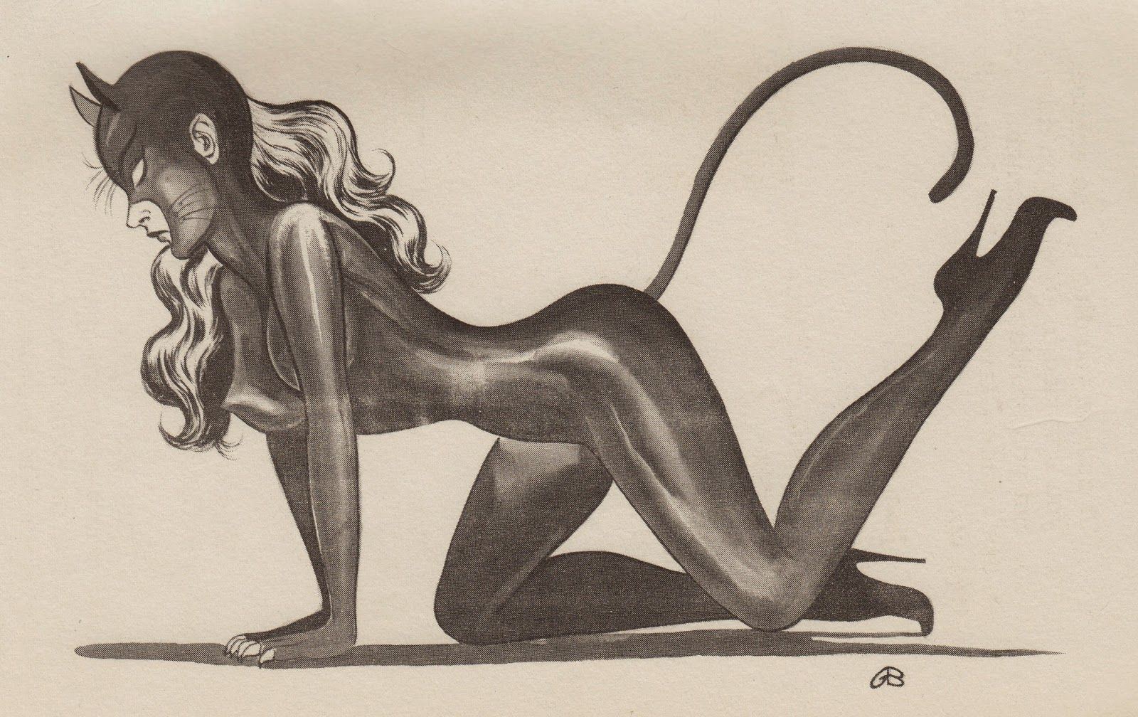 Il costumista inglese Bob Ringwood del film di Burton dice di essersi ispirato per il suo costume alla foto di un busto di donna con le varie parti cucite insieme realizzata da un’artista tedesca. Rimase affascinato dalla sua bizzarria allo stesso tempo sinistra e sessuale e ci basò sopra tutto il concept. Avendo approfondito la storia delle tutine in gomma, gli credo a metà. Il regista o Ringwood si sono sufficientemente informati sul passato di questo indumento tanto da far estrarre dall’armadio di Catwoman un impermeabile nero lucido, un ritrovamento un po’ impensabile per una schiava del rosa e del pastello. Caso fortuito o intenzione reale, l’impermeabile Macintosh è considerato il punto di partenza della Rubber Fetish Community di diffusione internazionale. Era un impermeabile di latex infuso col tessuto resistente all’acqua creato dal chimico scozzese Charles Macintosh. A metà degli anni Settanta gruppi di persone si vestivano solo dei suoi impermeabili per piacere personale e avevano creato il Macintosh Magazine dedicato alle fantasie su questo indumento, come riporta il documentario Dressing for pleasure (1977), che influenzò il punk nato negli stessi anni. Nel 1957 nasce AtomAge, brand di John Sutcliffe che diventerà poi anche rivista negli anni Settanta, che passa rapidamente da brand di abbigliamento resistente alle intemperie a creatore di tutine fetish per piacere estetico e sessuale. Fu lui il primo a creare quelle in gomma che assomigliano molto al costume di Catwoman. Inoltre, questo disegno di Gene Bilbrew sotto, non vi ricorda qualcosa?