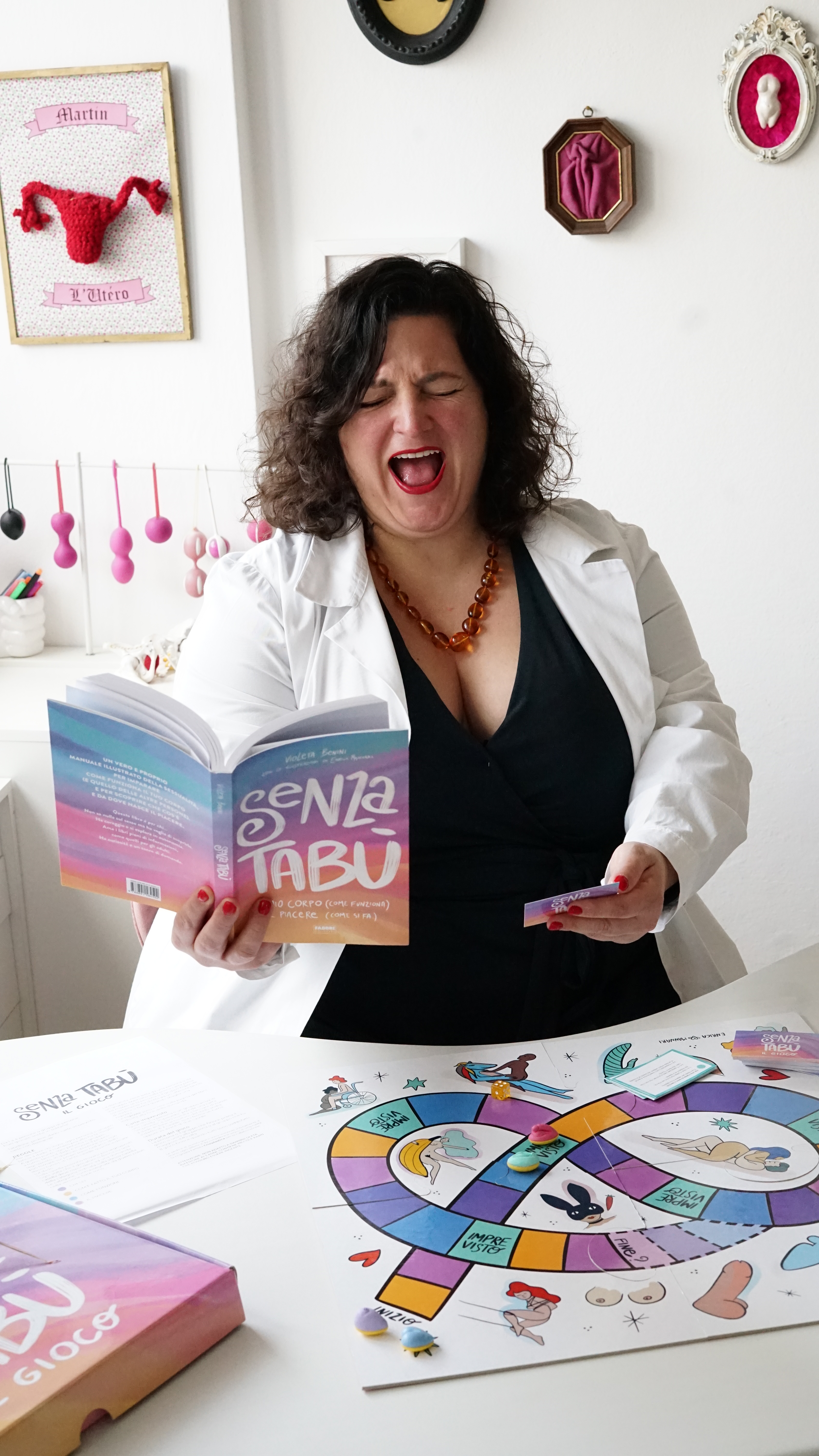 È possibile scaricare il gioco di Senza Tabù dal suo sito con base in quattro pezzi da stampare, ritagliare e incollare su cartone e le carte con le domande divise in quattro aree stile Trivial Pursuit: chi sei, com’è fatto il tuo corpo, come funzioni, il piacere. Ogni quesito indica la pagina del libro in cui si trova la risposta. Nel file da scaricare c’è pure un video tutorial della scultrice ed effettista speciale Cristina, in arte Crisiplastica, su come realizzare le quattro pedine di pasta modellabile a forma di vulva, pene, sedere e capezzolo. Il gioco può essere usato anche come strumento per insegnare educazione sessuale. “Le domande possono suscitare lo stimolo a parlare di o approfondire alcuni argomenti”, commenta Violeta.
