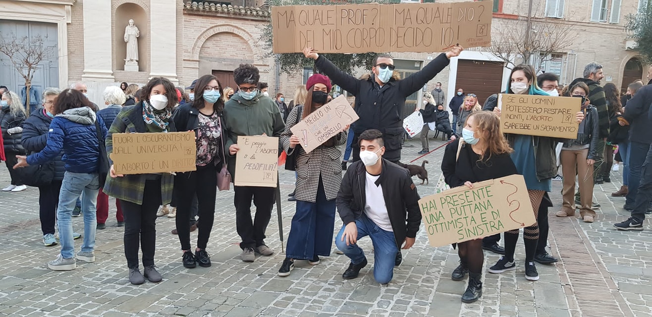 Abbiamo risposto come NUDM con due gruppi, Macerata e il nostro Transterritoriale, con una manifestazione in piazza a cui hanno partecipato complessivamente cinquecento persone. Siamo rimasti basit* dalla reazione popolare su quello che ha detto la Chiesa. Quest’ultima da millenni cerca di discettare sul corpo delle donne, non è una novità. La nostra risposta ha ignorato completamente quello che diceva l’istituzione religiosa ed è stata incentrata sulla lotta delle donne per ottenere un aborto decente. Non è possibile, ad esempio, che durante il lockdown le persone della provincia di Pesaro-Urbino abbiano dovuto recarsi al nosocomio di Urbino perché quello di Pesaro effettuava IGV solo ai positivi in quanto ospedale Covid. Non dovrebbe importarci nulla delle parole del vicario. La nostra costituzione parla chiaro sulla libertà di espressione, istigare all’odio di qualsiasi tipo è un reato (Legge Mancino, n. 205, ndr) e deve essere riconosciuto come tale.
