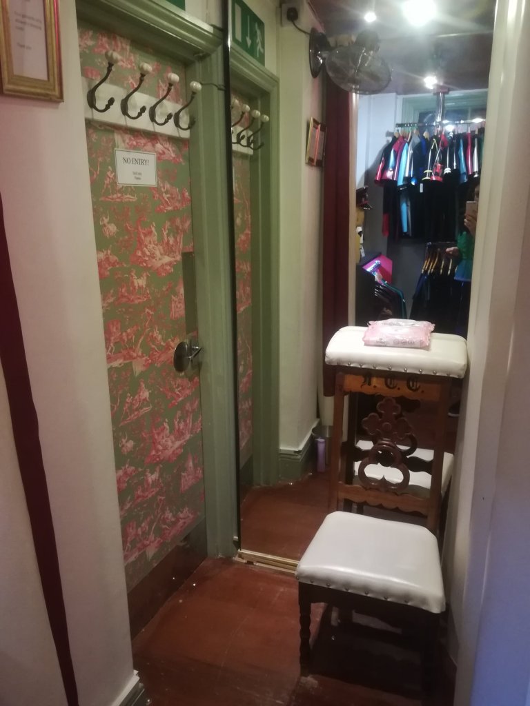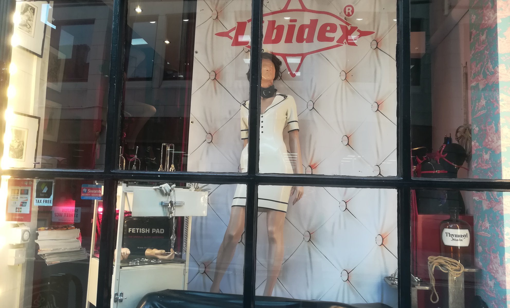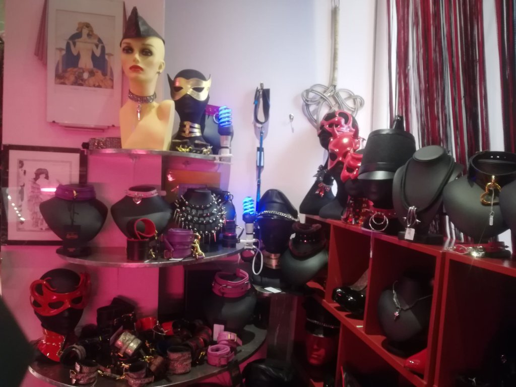 Nella boutique aperta nel 2004 oltre ad abbigliamento, accessori BDSM (fruste, corde, maschere, imbracature – harness, gabbie per pene, manette), si trovano siringhe per clisteri risalenti al diciottesimo secolo, dildo d’avorio vittoriani, un ariete, décolleté lucide nere dai tacchi a spillo di ferro, divinità di legno dal fallo gigante, battipanni. È aperta dalle 11 in poi. Nei camerini sono presenti borotalco e salviette detergenti per pulire gli indumenti aderenti dopo averli indossati. Il borotalco serve per entrare nel latex superstretto. La commessa mi ha spiegato che a seguito del loro uso, lava tutti gli indumenti con un liquido speciale Libidex. Se vi interessa pulirli a casa, si mettono nell’acqua calda senza aggiunta di sapone o altro. Si asciugano con un asciugamano. Il colore può opacizzarsi negli anni per effetto naturale della gomma. Non bisogna esporre i pezzi lungamente al sole o in un ambiente umido, altrimenti si deteriorano. Libidex prende la sua gomma dalla Malesia che è considerata la migliore. Libidex produce un latex attento alle allergie e cerca di filtrarlo il più possibile.Io non sono entrata in un completino di latex per motivi di tempo ma spero presto di farlo in uno targato Libidex perché ho una pelle molto sensibile.