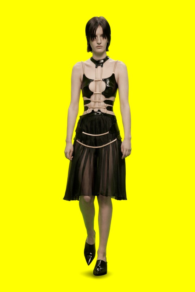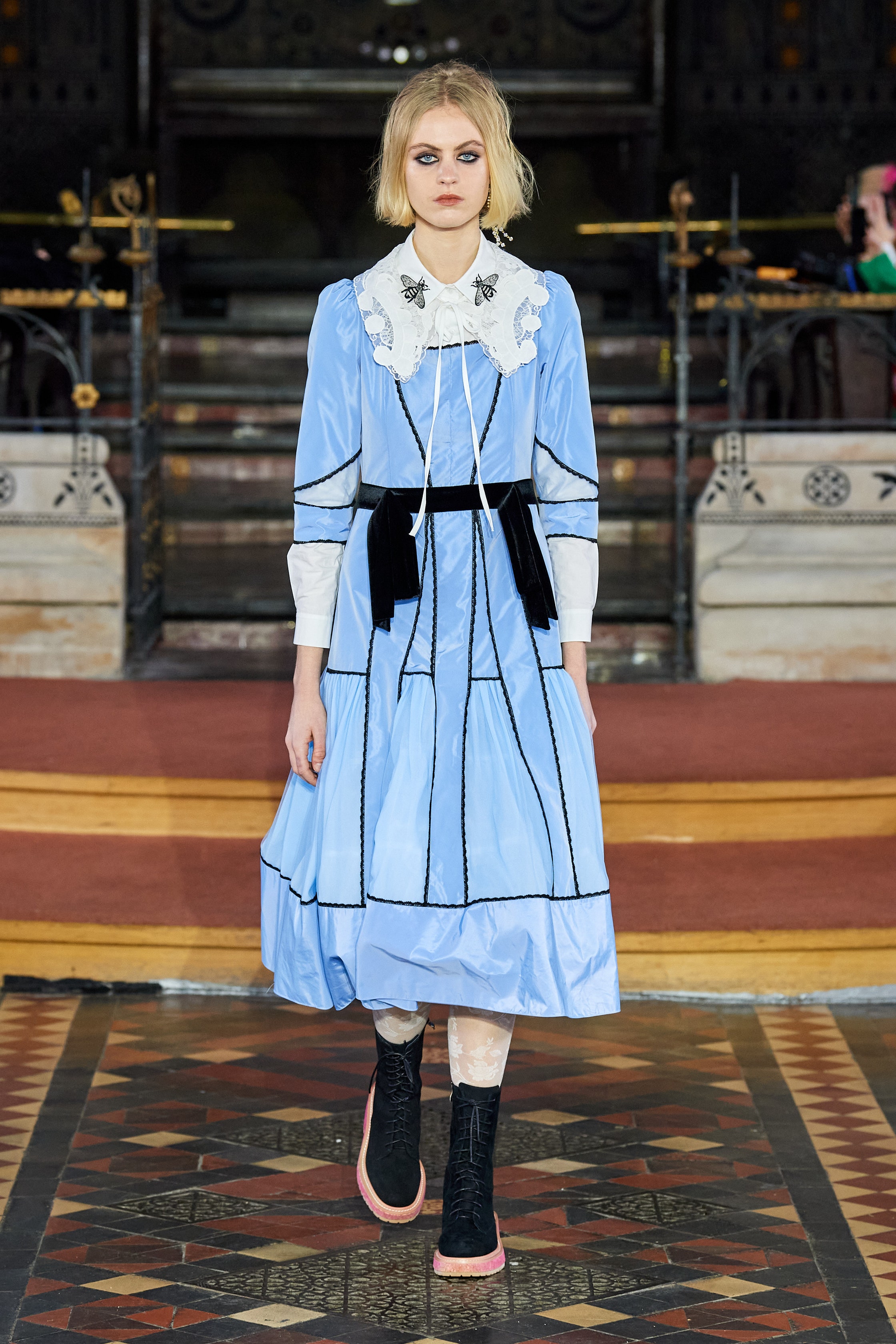 Richard Quinn. Richard Quinn ha sempre nutrito un amore per il BDSM concretizzato in questa collezione dall’immagine della drag queen americana Violet Chachki coperta interamente di latex nero lucico a spasso con un cane schiavo (in copertina). Il suo mix & match di vestiti dalle tipiche fantasie floreali inglesi con tute di latex indossate sotto e grandi cappelli a tesa larga che nascondono il volto con fessure per gli occhi sembrano richiamare il grande amore dell’Inghilterra per la cultura BDSM (per saperne di più, cliccate qui). Un altro look strabiliante è quello ispirato al vestito da matrimonio di Yves Saint Laurent del 1965 lavorato a maglia per il quale lo stilista aveva ripreso le sembianze di una matrioska russa.