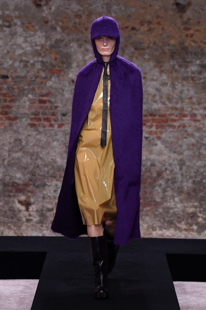 Raf Simons. Raf Simons ha trasformato il latex in un elemento ordinario del guardaroba: in stivali da pioggia neri, impermeabili, vestiti. Particolari i cappelli elmetto con fessura, che ricordano nel concetto quelli di Richard Quinn, e i cappelli da baseball uniti a mantelle di lana. Il mood della collezione è dark e l’atmosfera inquietante. L’unico indizio che ha dato sulle sue creazioni è l’ispirazione: il quadro Proverbi Fiamminghi di Pieter Bruegel Il Vecchio (1559). Si tratta di un’illustrazione letterale di alcuni proverbi e idiomi della lingua olandese.