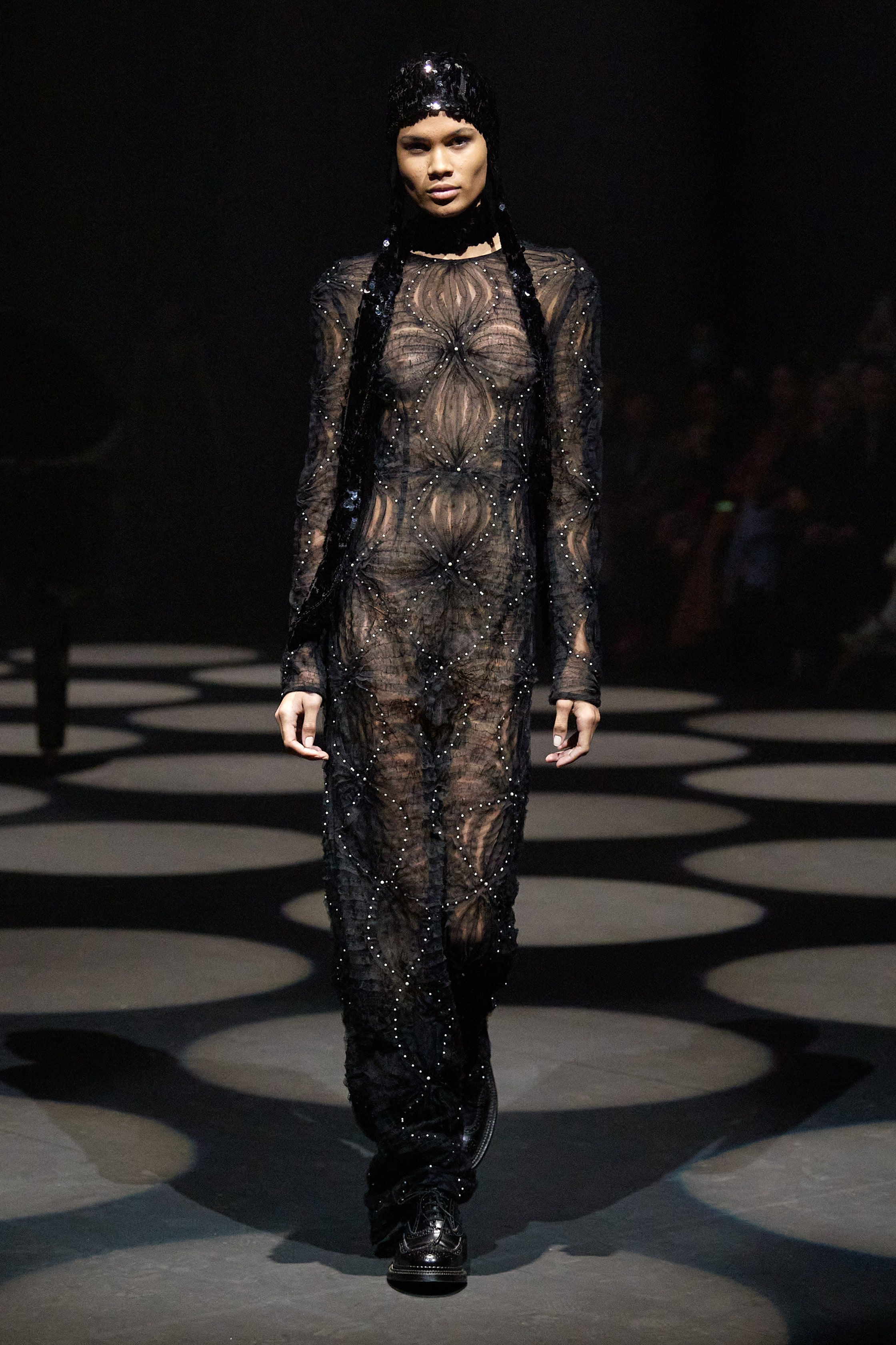 Edward Crutchley. Cultura gotica, crossdressing e celebrazione della cultura queer. Questa la sfilata di Crutchley che combina pezzi indossabili a mise e vestiti da club. Spicca su tutti un abito a maglia lungo bianco costellato da ovali che scoprono la pelle nuda (ricorda un po’ Rick Owens). Attenzione anche all’ambiente per la pelle riciclata delle scarpe platform e il poliestere Lurex.