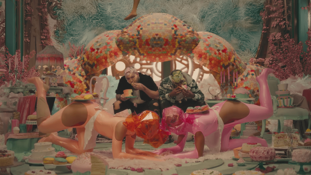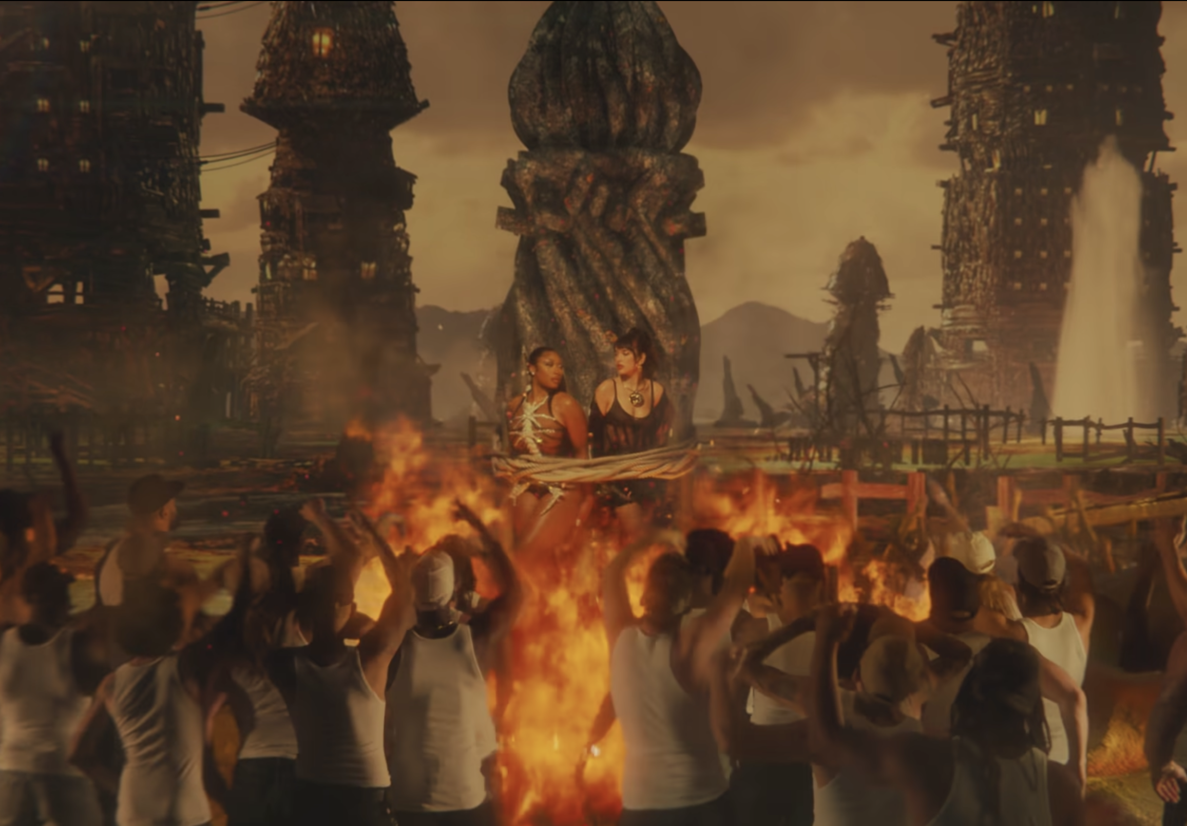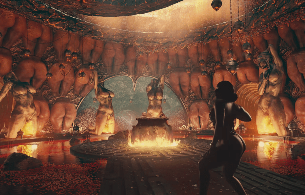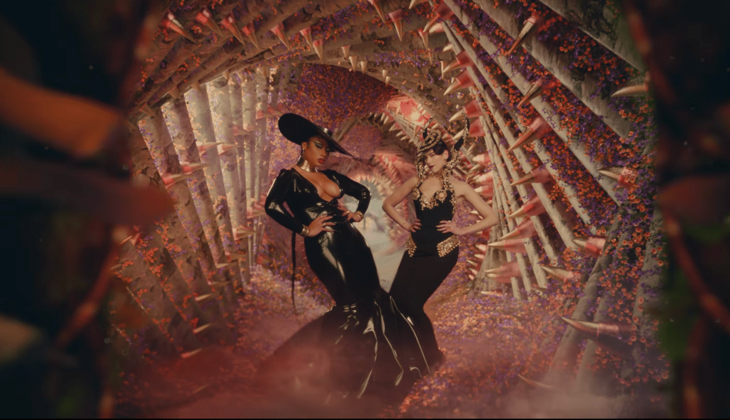 Consiglio il video che è a metà tra un candy shop in una foresta fatta di alberi con i tronchi scolpiti di donne formose e un inferno di fuoco tra palafitte a forma di peni. Infatti Megan Thee Stallion e Dua Lipa richiamano negli abiti e nell’ambientazione le spire di piante e ragni pericolosi. Vedove nere che attirano due uomini con una dolce promessa ingannatrice. Dopo che si sono pappati i loro dolci, cadono in un grande calderone acceso in una sorta di grande tempio circolare della femminilità, che sembra più della fertilità date le colonne con corpi dai grandi seni e dal ventre abbondante e pareti tappezzate da sederi che scuotono le natiche, con un albero dalle foglie rosse al centro che è probabile simboleggi l’albero della vita (forse un riferimento all’albero dell’Eden). D’altronde Eva per tanto tempo nella storia è stata considerata una donna fragile perché si era lasciata ingannare dal Serpente, il Diavolo, e fu considerata la giustificazione per la persecuzione delle streghe. Come, appunto, delle streghe sul finale del video Megan e Dua Lipa vengono messe al rogo attaccate al totem di un pene di legno e circondate da una folla inferocita di uomini ma riescono a salvarsi usando il fuoco della loro pira e bruciando tutti. L’ultimo frame ci fa vedere Megan sospesa nel vuoto davanti ad un serpente acciambellato con un divanetto rosso tra le sue spire. Sembra essere eccitata da sé o fare l’amore con un essere invisibile.