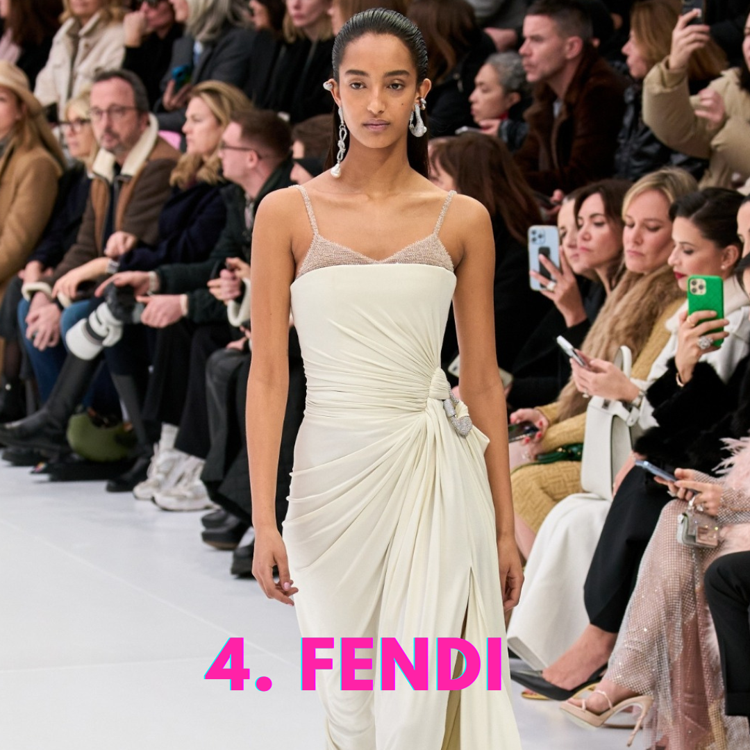 4. Fendi. Kim Jones ha lavorato al drappeggio e a nuove tecniche per non far sembrare la pelle ciò che è. È riuscito a creare degli slip dress da sera eleganti e ricercati con una sensualità delicata.