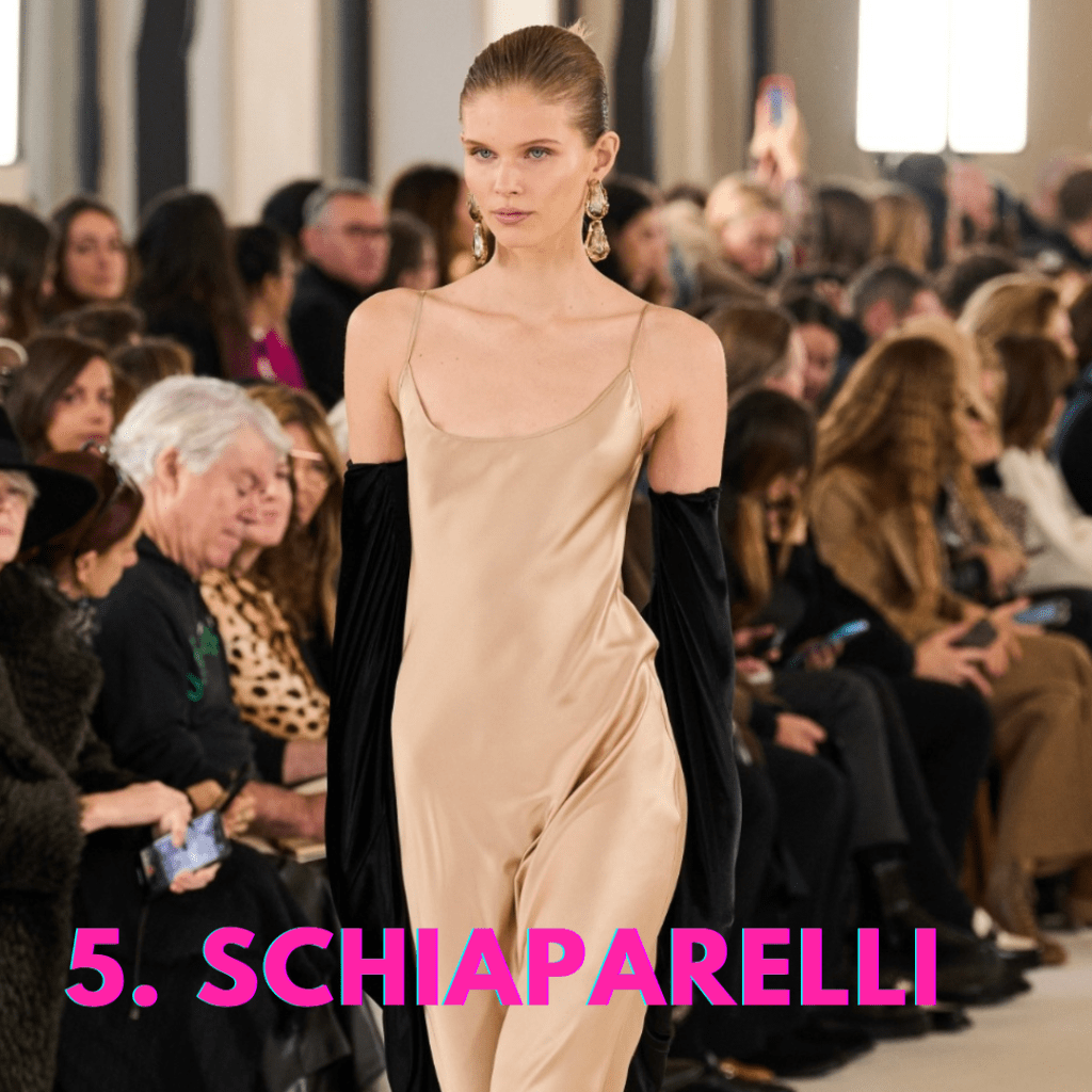 5. Schiaparelli. La scelta di rappresentare la testa di animali morti come trofei di caccia sugli abiti la trovo di cattivo gusto e non creativa. Tuttavia, il riferimento di Daniel Roseberry era intellettuale: si è ispirato alle fiere che Dante Alighieri incontra nel suo Inferno.