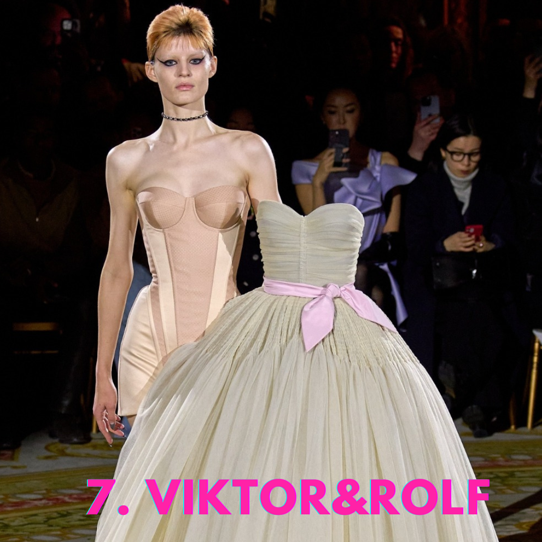 7. Viktor&Rolf hanno voluto stupire facendo credere al pubblico nei primi tre vestiti della sfilata che il tema fosse quello della classica Cenerentola ma non è stato così. Piano piano è venuta fuori un’Alice nel Paese delle Meraviglie che si trova sottosopra in vestiti confezionati 3D. Dietro l’abito quasi finto si vede una guêpière anni Quaranta.