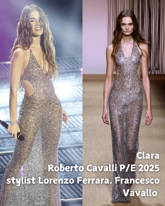 2. Clara in Roberto Cavalli P/E 2025, stylist Lorenzo Ferrara e Francesco Vavallo. Sensuale e trasparente.