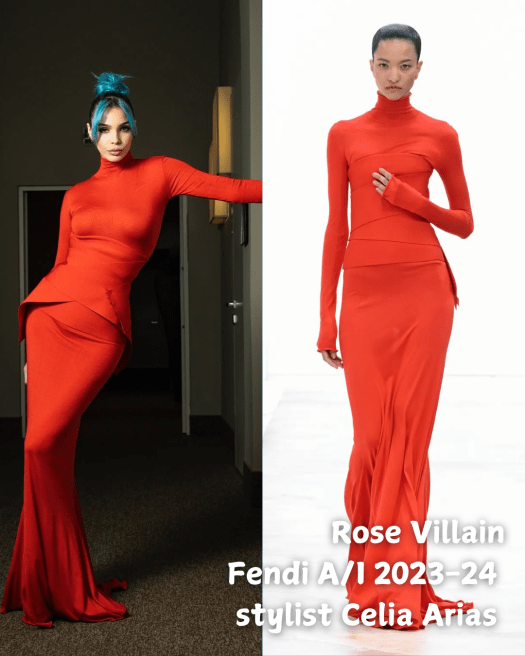 4. Rose Villain in Fendi A/I 2023-24, stylist Celia Arias. Nonostante un abito che copre invece di scoprire, il rosso fuoco la rende prorompente sul palco.