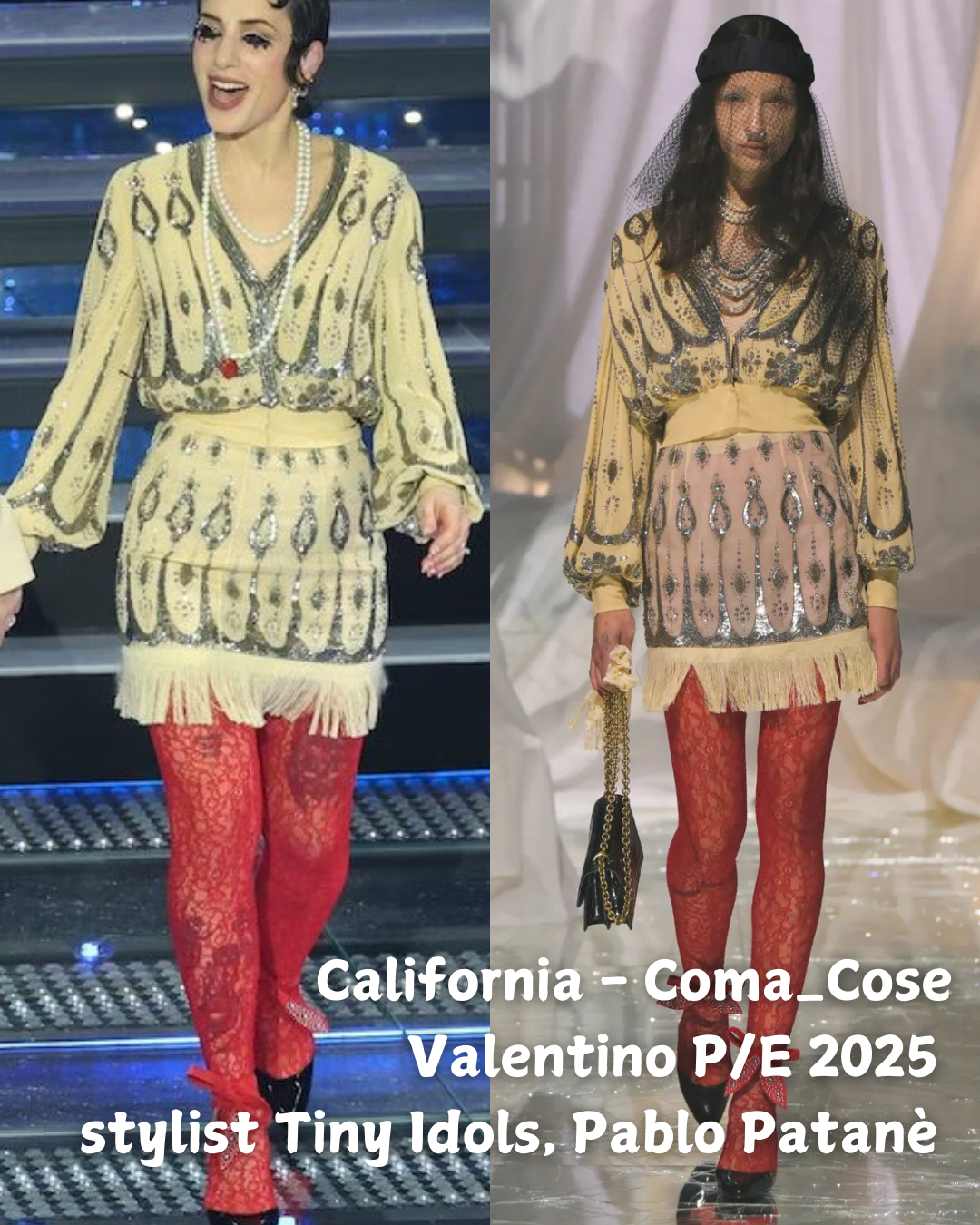 2. California dei Coma_Cose in Valentino Primavera/Estate 2025, stylist Tiny Idols e Pablo Patanè. La collezione di debutto a Valentino di Alessandro Michele, Pavillon des Folies, rende i due performer dei personaggi con del carattere. La giocosità degli outfit è in linea con la loro canzone Cuoricini. Le calze di pizzo rosso sono il dettaglio da copiare.