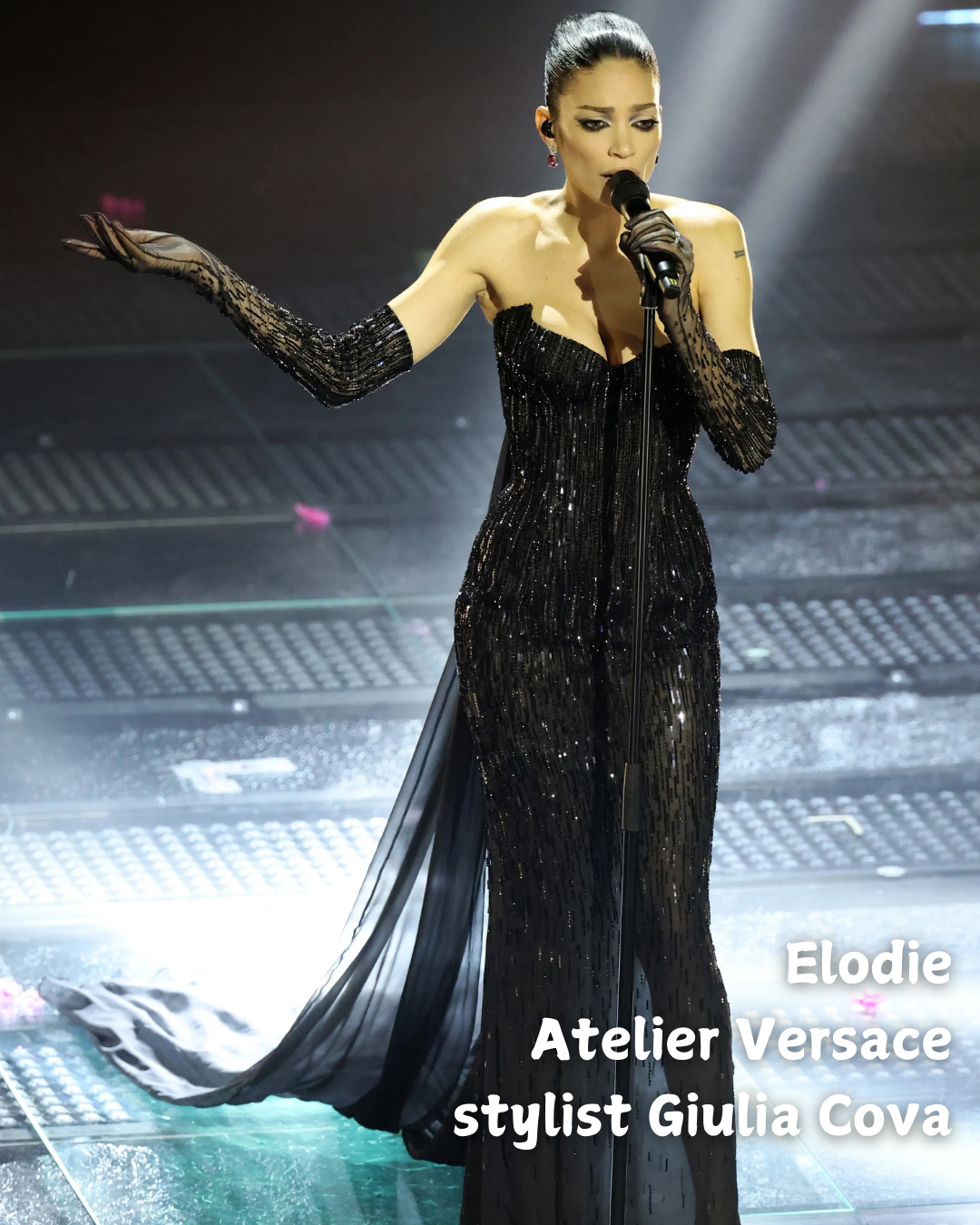1. Elodie regina quasi incontrastata degli abiti eleganti e da diva (il primo vestito argento di Prada è stato un po’ criticato). L’ultimo di Atelier Versace era lungo con strascico, corpetto a cuore e guanti in seta e perline, stoffa nera semitrasparente. Un cigno nero dal canto potente.