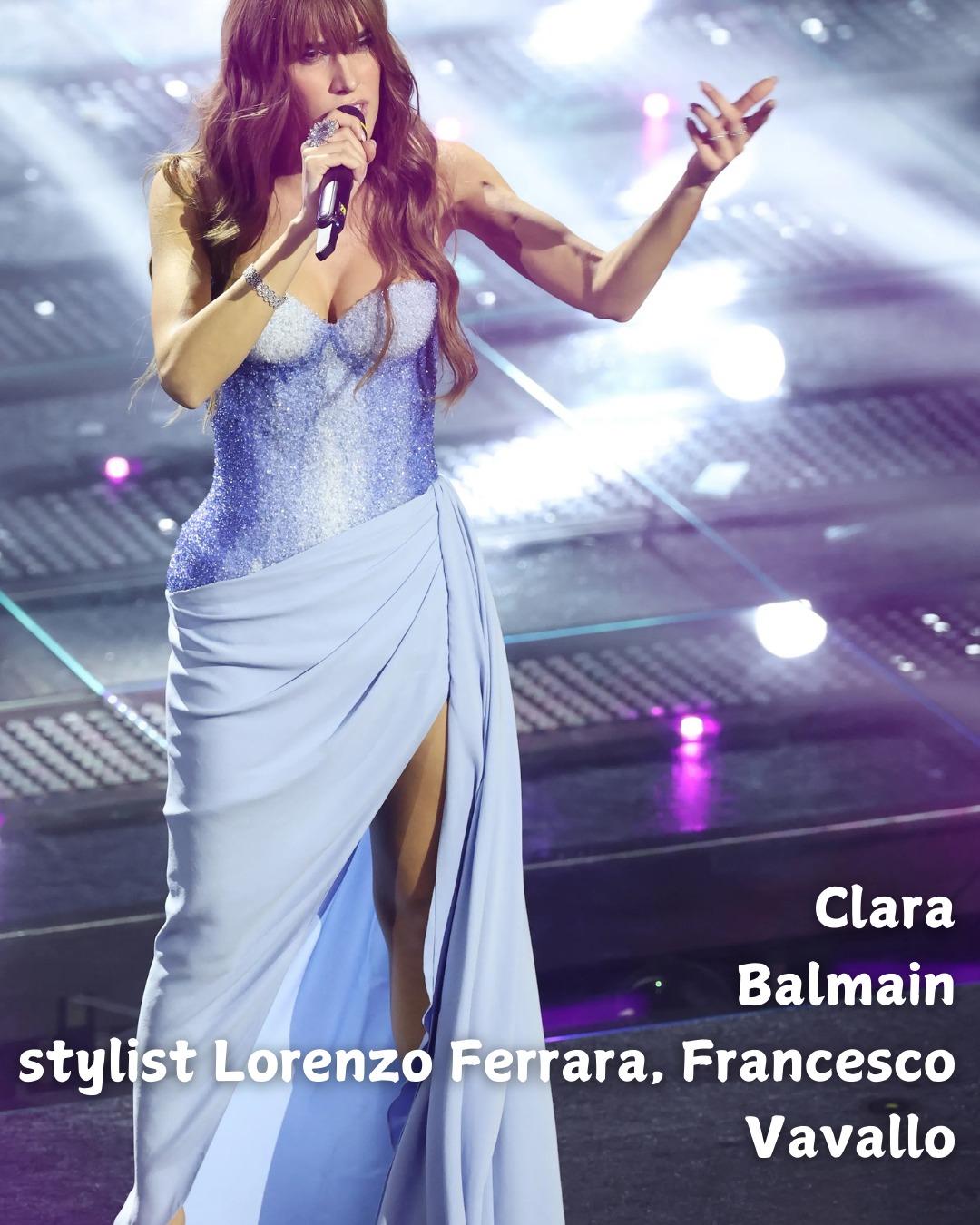 2. In molti sui social hanno visto in Clara una Fata Turchina, ma io ci vedo di più una Cenerentola moderna che non ha bisogno di madrine per andare al ballo, spirito in linea con la donna forte di Balmain. Indossava un bustier-body con coppe celeste sfumate di azzurro e gonna leggera dappreggiata con spacco laterale.