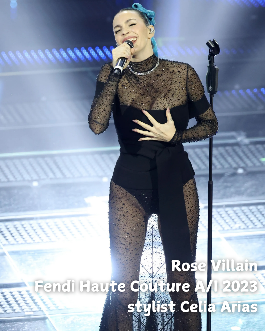 3. Rose Villain ha scelto un abito più complesso lungo nero trasparente con strascico e corsetto in maglia ricamato con cristalli e perline, maniche lunghe, collo alto, firmato Fendi Haute Couture Autunno/Inverno 2023. Un’esplosione di sexytudine.