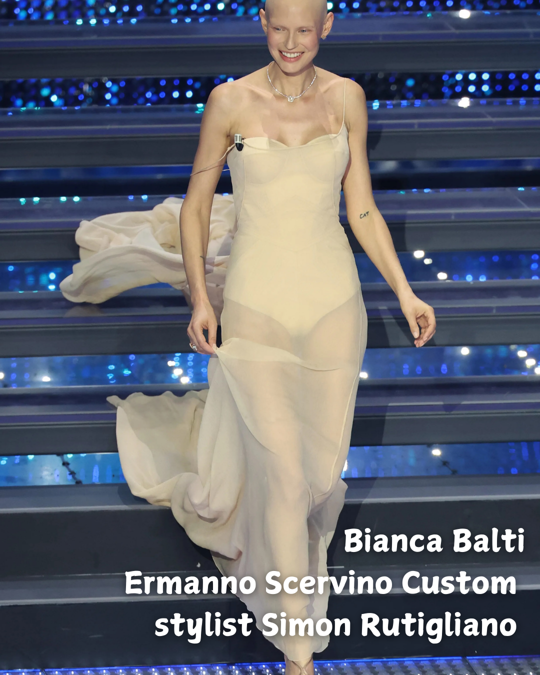 7. Bianca Balti ha optato per un look sobrio con un vestito lungo di chiffon color fard con strascico, corsetto strutturato in raso di seta e microspalline, realizzato su misura da Ermanno Scervino. Lei ha brillato particolarmente nella seconda serata di Sanremo ed è stata una delle poche che ha saputo tenere testa al modo di fare sbrigativo di Carlo Conti, assieme a Geppi Cucciari.