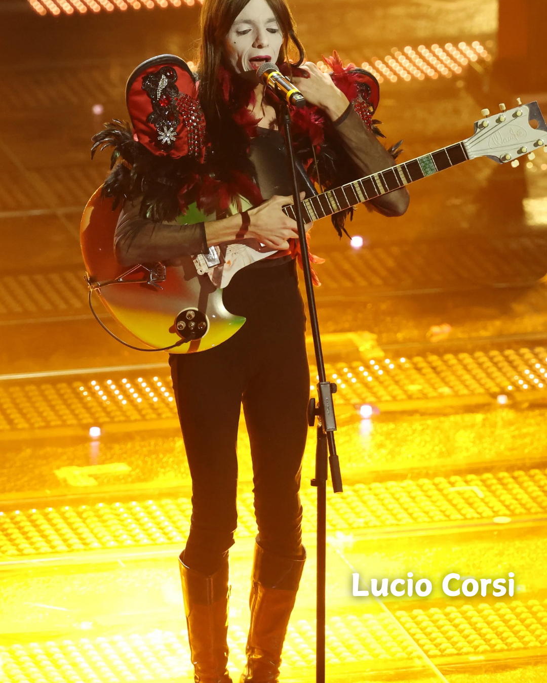 8. Premio all’inventiva per Lucio Corsi che crea i suoi look da solo, un po’ glam rock, un po’ gatto con gli stivali, innamorato però di Topo Gigio (ci ha duettato nella serata delle cover). Un particolare su tutti: per gonfiare le maniche a palloncino delle sue mitiche giacchette colorate ha usato pacchetti di patatine. Ha ammesso che “non gliene frega nulla della moda” e che si rifà all’estetica glam rock degli anni Ottanta in cui i musicisti facevano brillare di genio i loro stracci.