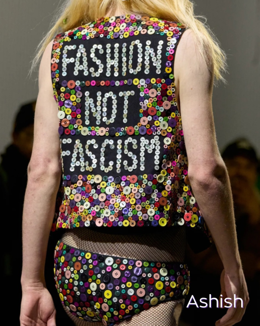 3. “Ora più che mai è importante essere visibili, essere visti, mantenere il nostro spazio, e non renderlo o concederlo“. Così ha affermato il fashion designer Ashish Gupta nel backstage della sua sfilata Ashish sgargiante e piena di slogan di resistenza.