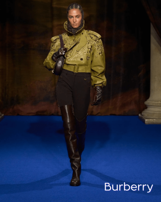 5. Daniel Lee a Burberry è stato influenzato dall’eccentricità di “Saltburn” e ha voluto riportare sulla passerella quello spirito bohémien. D’ispirazione anche “Brideshead Revisited”, “Gosford Park”, “Downton Abbey”. Da notare il ritorno dei cuissard, stivali altissimi, per party sexy e decisi.