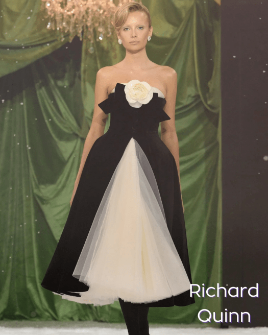 8. Richard Quinn rievoca l’haute couture degli anni Cinquanta e Sessanta ad una festa privata con tanto di edificio georgiano alle spalle e neve che cade. Vestiti bianchi e neri con corsage di rosa in vita o al collo. L’obiettivo del designer è portare l’allure di una certa Parigi a Londra