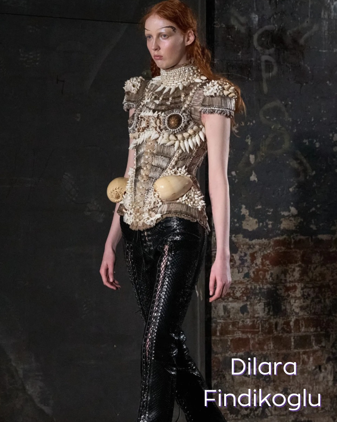 1. “Venus in Chaos” è il titolo della collezione della stilista turca Dilara Findikoglu, che l’ha definita un ammutinamento del divino femminile. “Si tratta di trovare la bellezza attraverso la distruzione – ha spiegato – È un po’ sulla mia vita e anche quella di tutti”. Il processo del trovare una nuova pelle è stato descritto dall’ultimo abito di pelle dorata inciso dal suo fidanzato tatuatore Jonah Slater con motivi floreali simili ad arterie, creato dall’artigiano body designer Whitaker Malem.