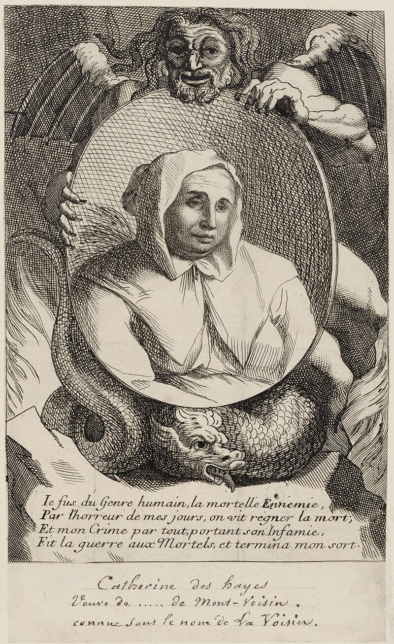 La marchesa Françoise-Athénaïs de Montespan, una delle amanti preferite di Luigi XIV, acquistava pozioni d’amore da Catherine Monvoisin (nome da nubile Deshayes), conosciuta da tutti come La Voisin (la vicina). Un’avvelenatrice professionista, chiaroveggente, abortista e devota cattolica che aveva per cliente la stessa corte reale. Si narra che nei suoi intrugli amorosi fossero contenuti sangue mestruale, sperma, sangue di pipistrello e limatura di ferro. Più in generale, vendeva ai nobili “le polveri dell’eredità”: un miscuglio di arsenico, aconito, belladonna e oppio. L’amante del re era ricorsa ai suoi favori per allontanare la prima amante ufficiale, Louise de La Vallière, e diventarla a sua volta. L’idillio di Françoise con il re durò tredici anni, durante i quali gli diede sette figli. Arrivò una ragazza diciassettenne, Angélique de Fontanges, a cui il monarca conferì il titolo di duchessa, che non aveva mai concesso alla marchesa. Dopo un aborto spontaneo, Angelique si indebolì così tanto da pensare di essere stata avvelenata e morì a diciannove anni. Nel frattempo, l’avvelenatrice Marie Bosse, ubriaca, commise l’errore di vantarsi della sua pensione assicurata per i veleni venduti ai nobili proprio davanti a un avvocato, che la denunciò alle autorità. Bosse menzionò anche il nome di La Voisin, sua rivale, che fu arrestata mentre usciva da una chiesa. La Voisin raccontò alla Chambre Ardente che Montespan le avesse dato un’importante somma di denaro per avvelenare Fontanges e il re. La versione fu confermata dalla figlia di Monvoisin, Marie Marguerite, dopo la morte della madre sul rogo per stregoneria (durante la perquisizione in casa furono trovati libri di magia nera, frammenti di ossa e ceneri di bambini). Il re ordinò che tutti i documenti delle indagini fossero sigillati e custoditi in sicurezza, cercò di mantenere segrete le accuse rivolte alla sua ex amante e poi la spedì in un convento, dove rimase fino alla morte.